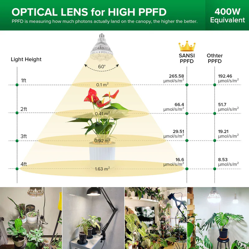 - PPF: 27 μmol/s, PPFD: 152.83 μmol/s/㎡ at 1 ft.
